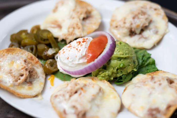 Cheese quesadilla, beef nachos, chciken nachos, chicken flauta, mini brisket chimichanga. Served with guacamole, sour cream, and jalapeños.