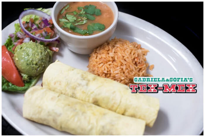 Grilled chicken or beef rolled in flour tortillas. Served with rice, charro beans, fresh guacamole, and pico de gallo.