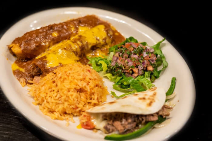 Three grilled flour tortillas, filled with oven roasted brisket and Jack cheese. Served with rice, charro beans, and avocado salad.