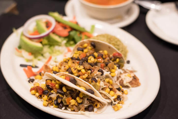 Three corn tortillas filled with chili-garlic chicken. Served with charro beans, Mexican rice, and avocado slice.
