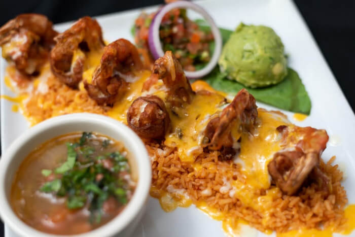 Six bacon-wrapped jumbo shrimp stuffed with Jack cheese and poblano pepper. Served with rice, bean soup, pico de gallo, and guacamole.